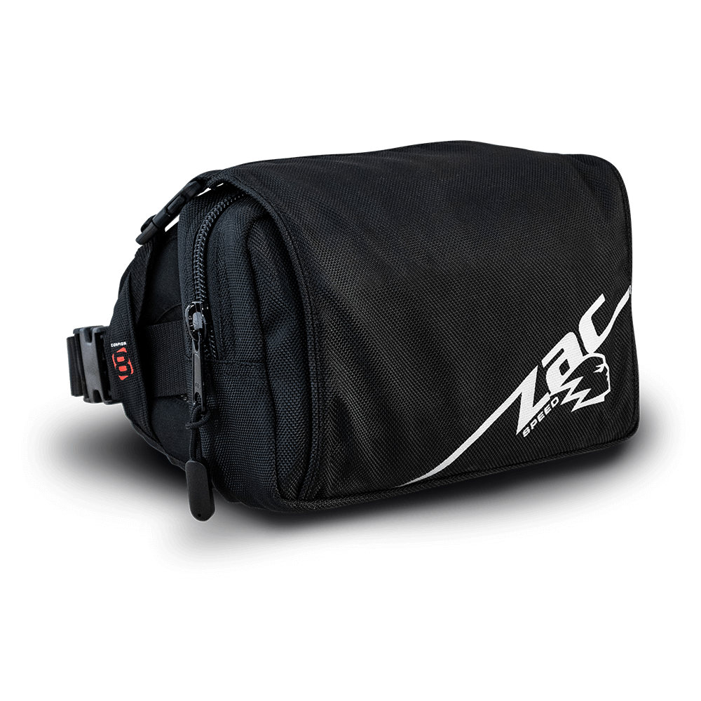 Compact tool pack designed to carry essential tools and maps, usable as a standalone bum bag or integrated into Zac Speed hydration pack harness systems. Built for off-road and enduro riders needing flexible, secure tool storage.