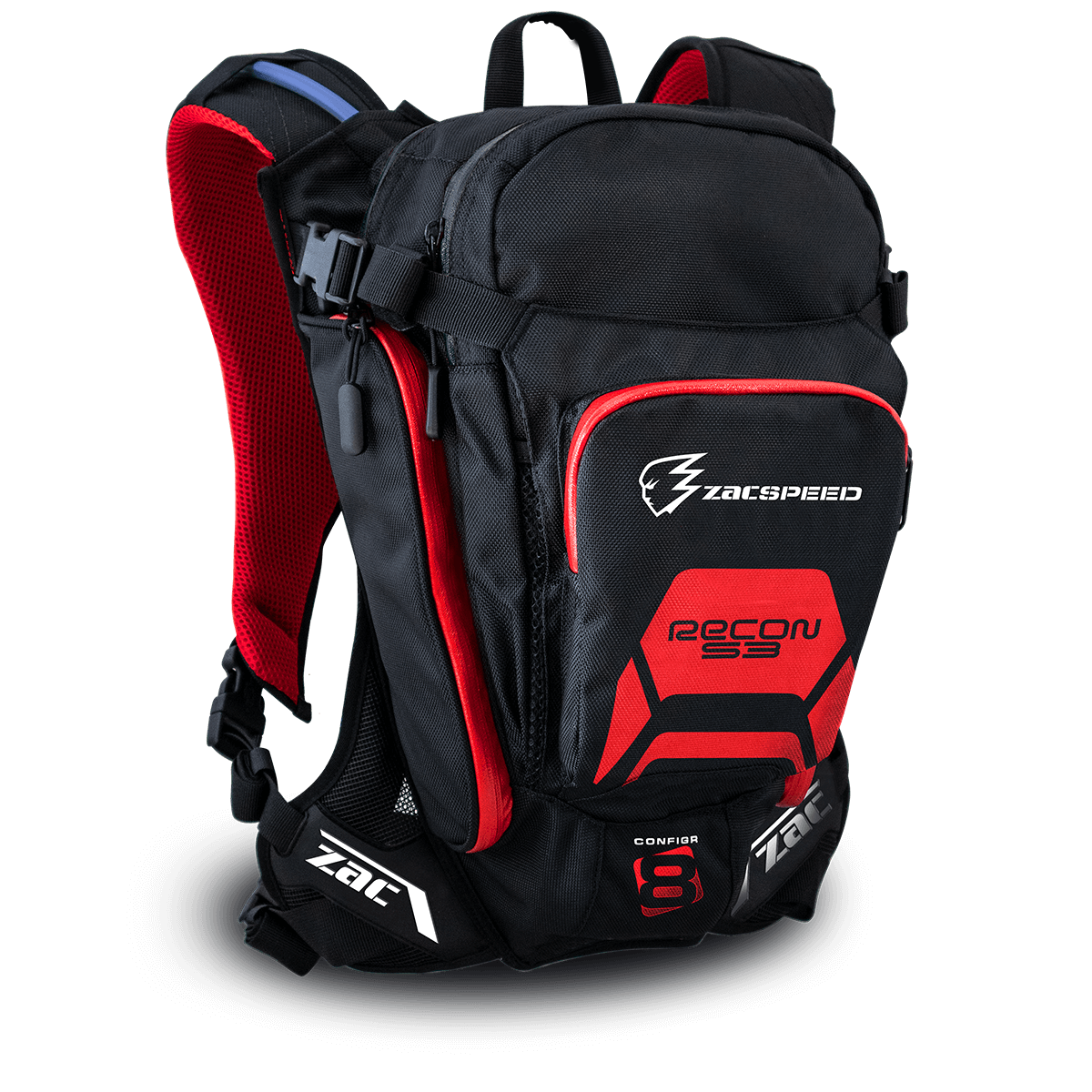 Built as part of the Zac Speed CONFIGR8 modular system, the Recon features a secure harness locking system, integrated back protection, and multiple storage compartments including a dedicated side tool pocket. Its layout ensures balanced weight distribution and easy access to gear while riding in demanding off-road conditions.