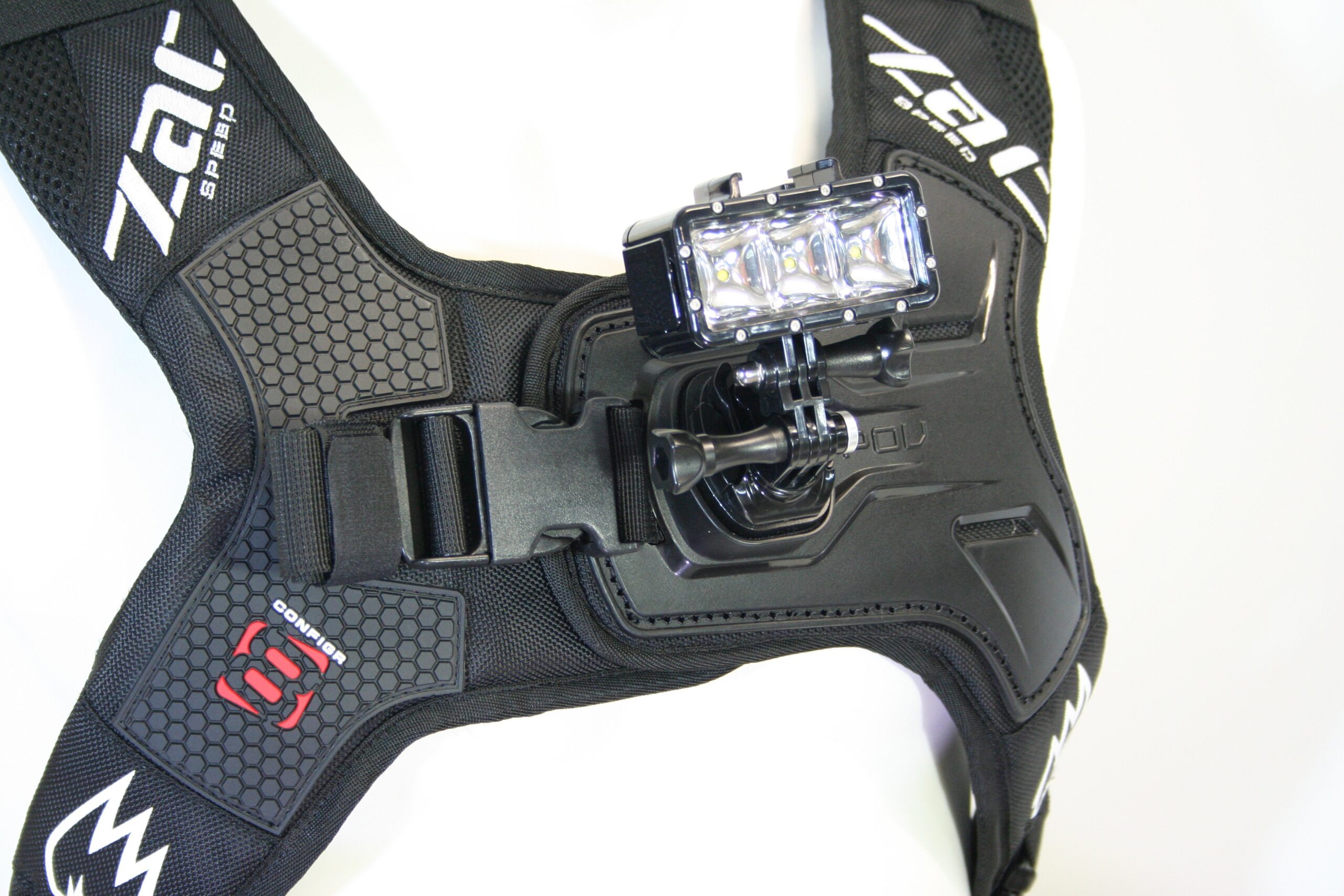Modular replacement harness featuring a front-mounted camera system, designed to integrate with Zac Speed hydration packs for hands-free POV filming during off-road and enduro riding.